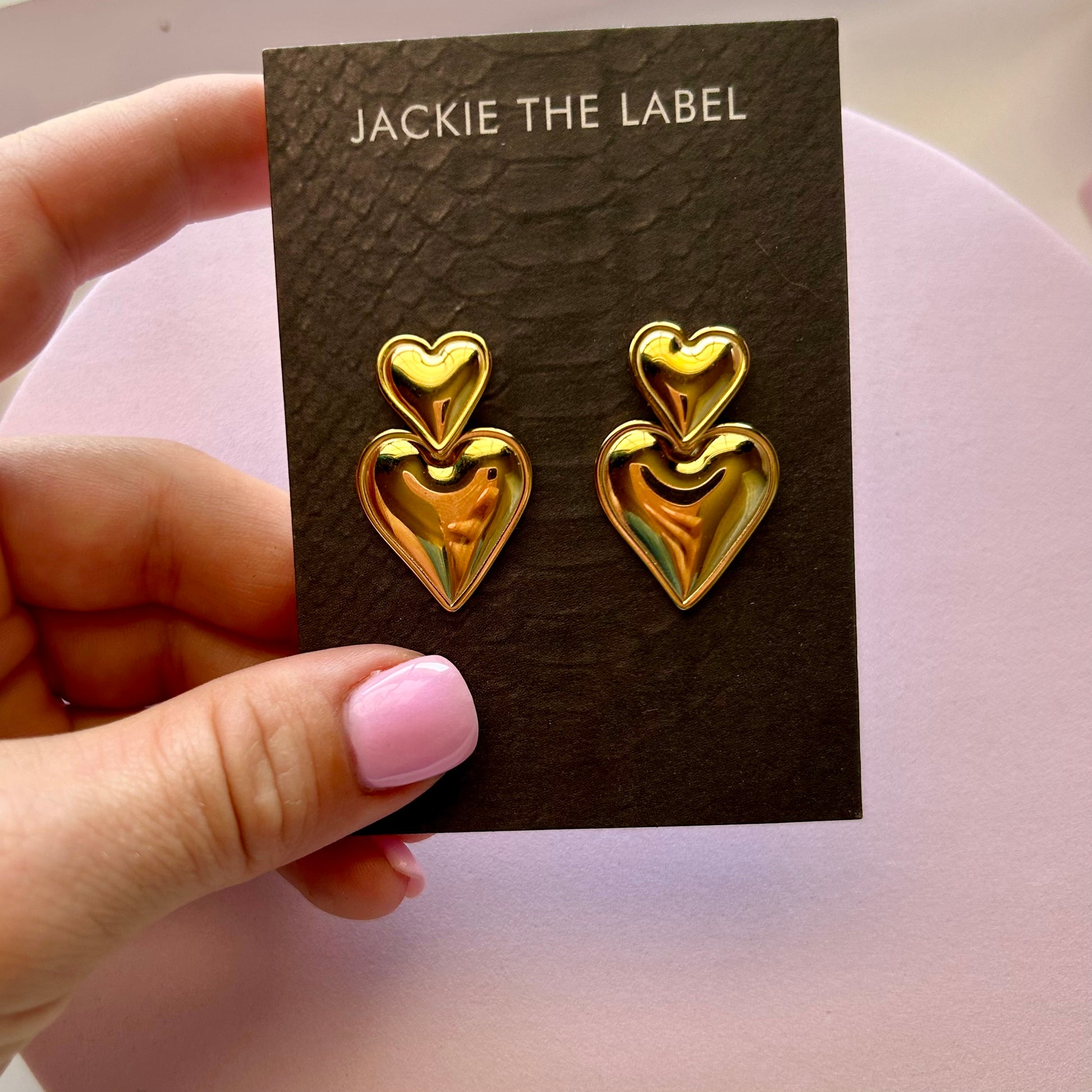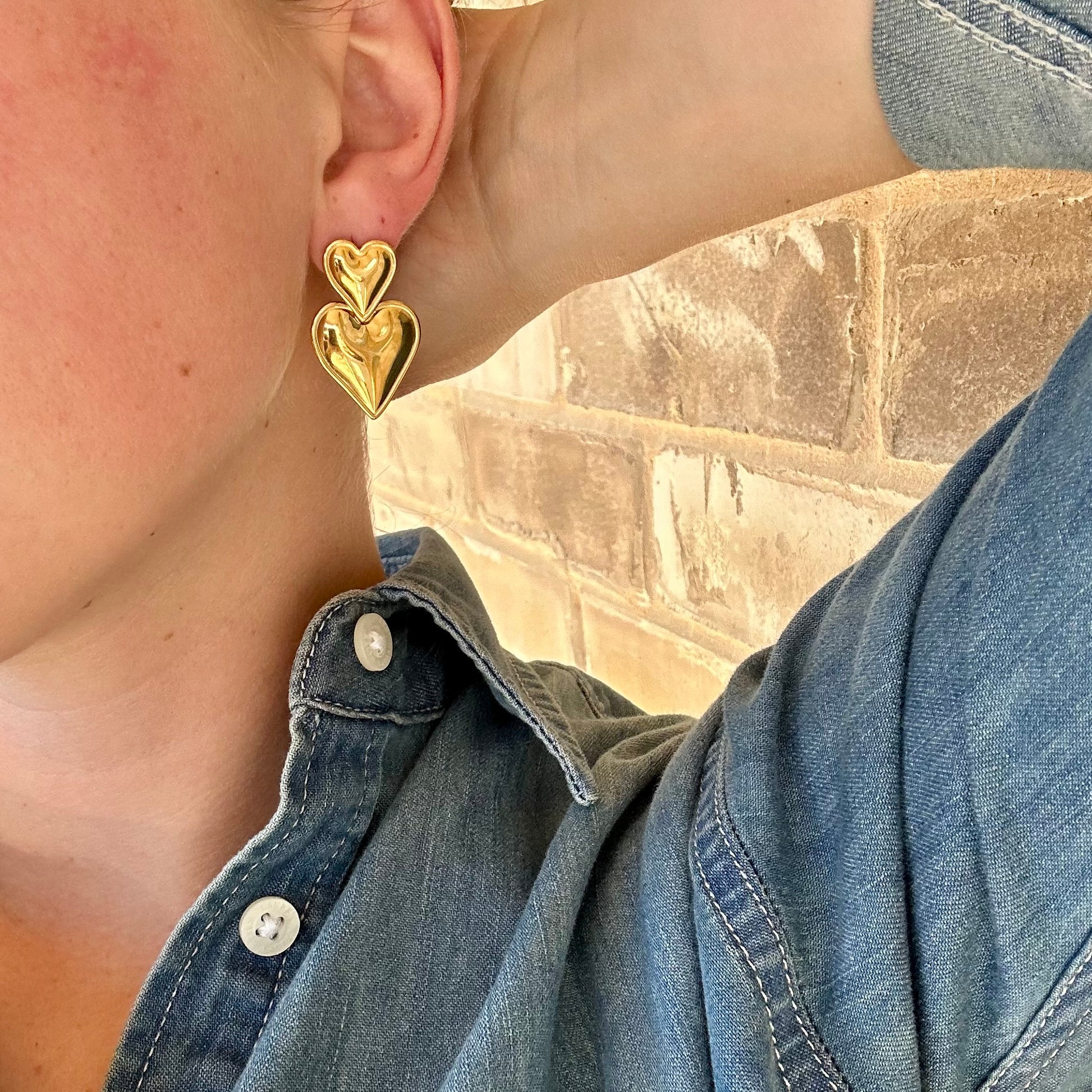 Adore You Dangle earrings These 18K Gold Plated earrings feature a Non Tarnishing Layered Heart design made of stainless steel, measuring 1.2" in length and 0.8" in width.