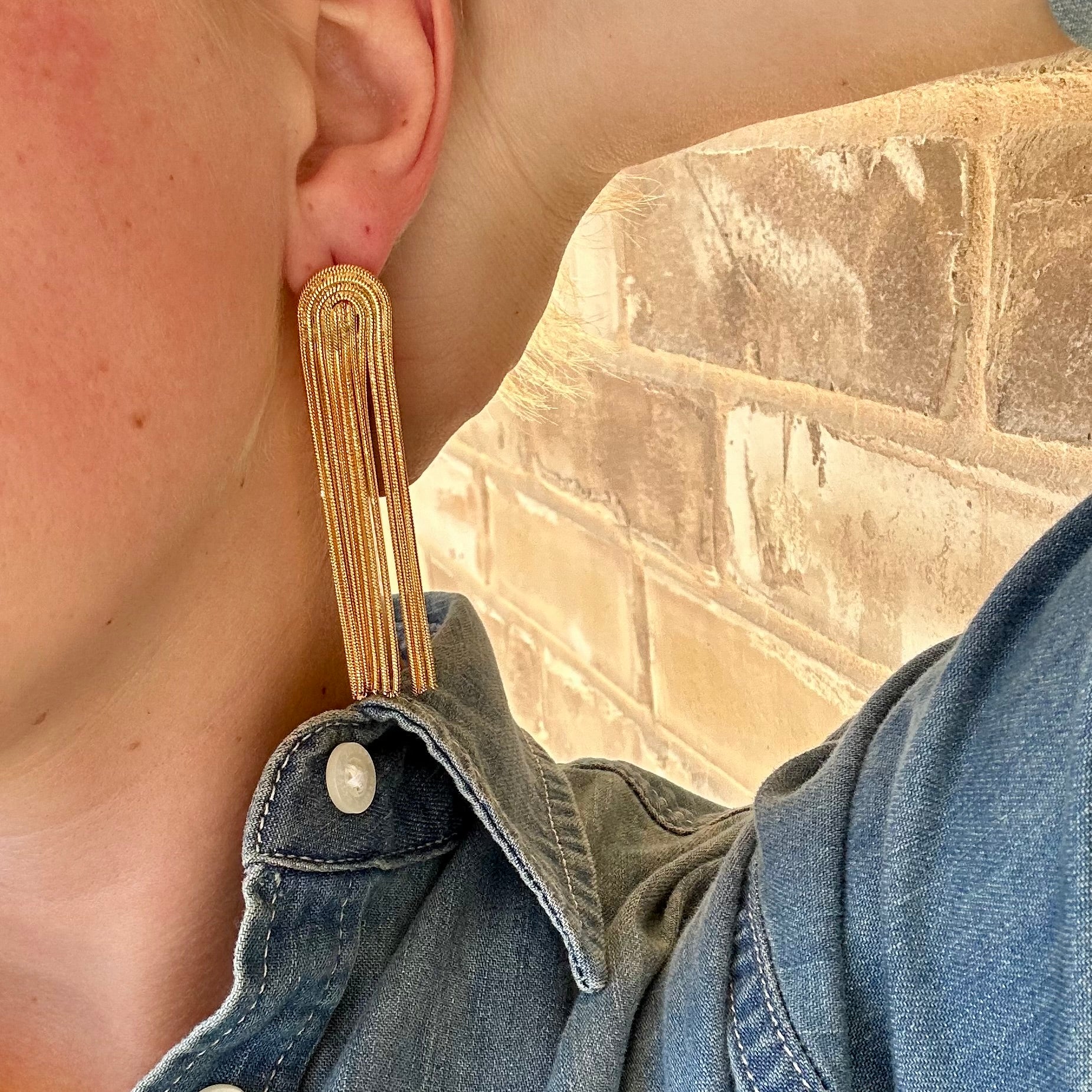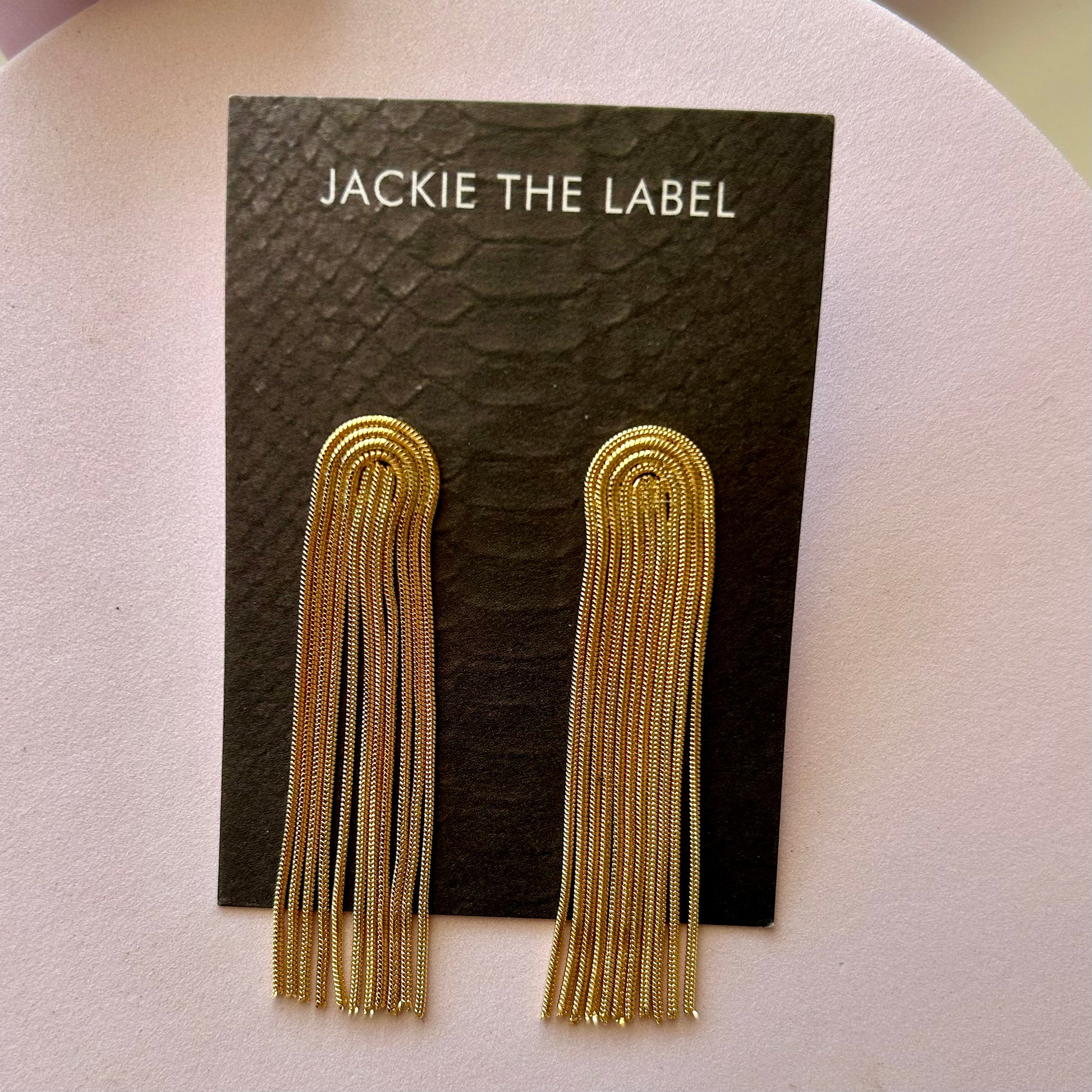 Made with non-tarnish 18K gold plating and stainless steel, these dressy earrings are both durable and luxurious. Measuring at 2.6 x 0.5 inches, they add a touch of sophistication with their delicate chain tassels. These would be stunning with an Updo!