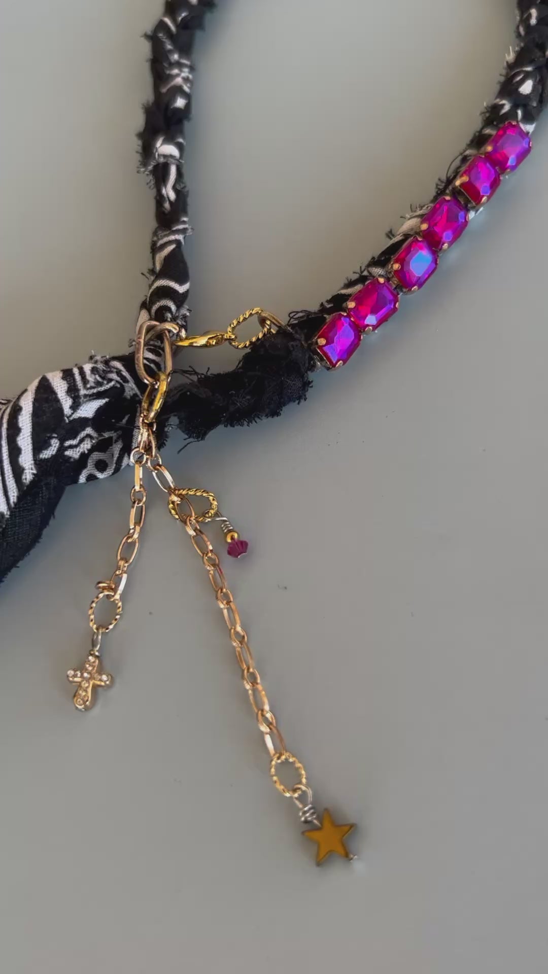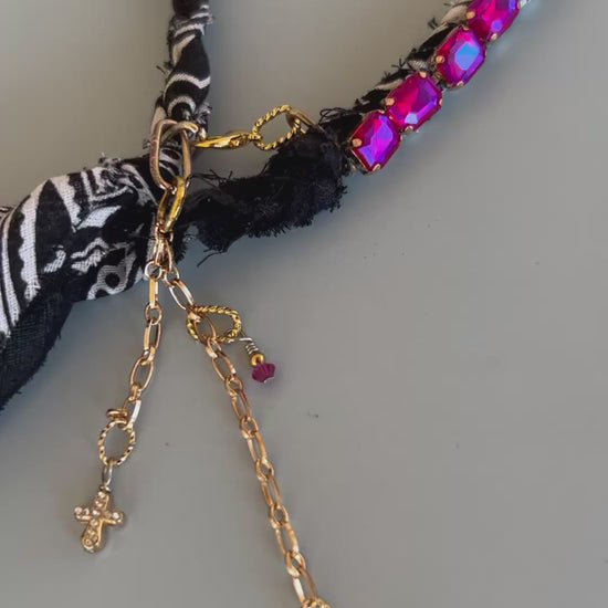 A little grit, a little glam — the pinky Promise bandana necklace is made for the bold-hearted. Hand-braided from a classic black-and-white bandana, this piece features a radiant row of fuchsia-pink crystals, A gold-toned chain dangles a star and cross charms, adding movement, meaning, and a rebellious touch of sparkle.
