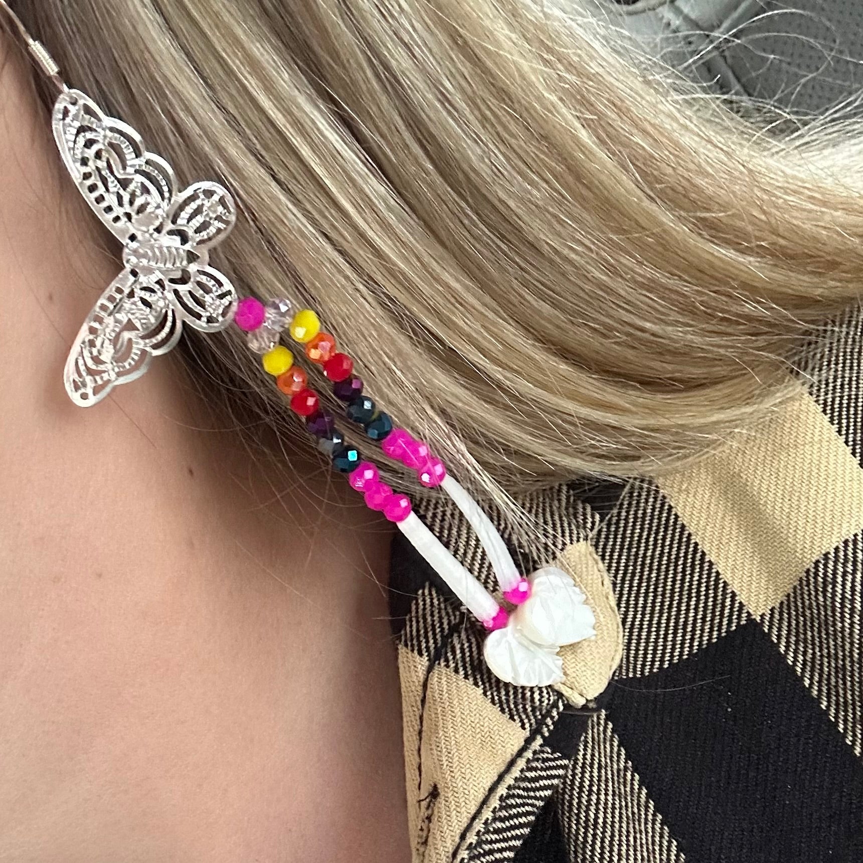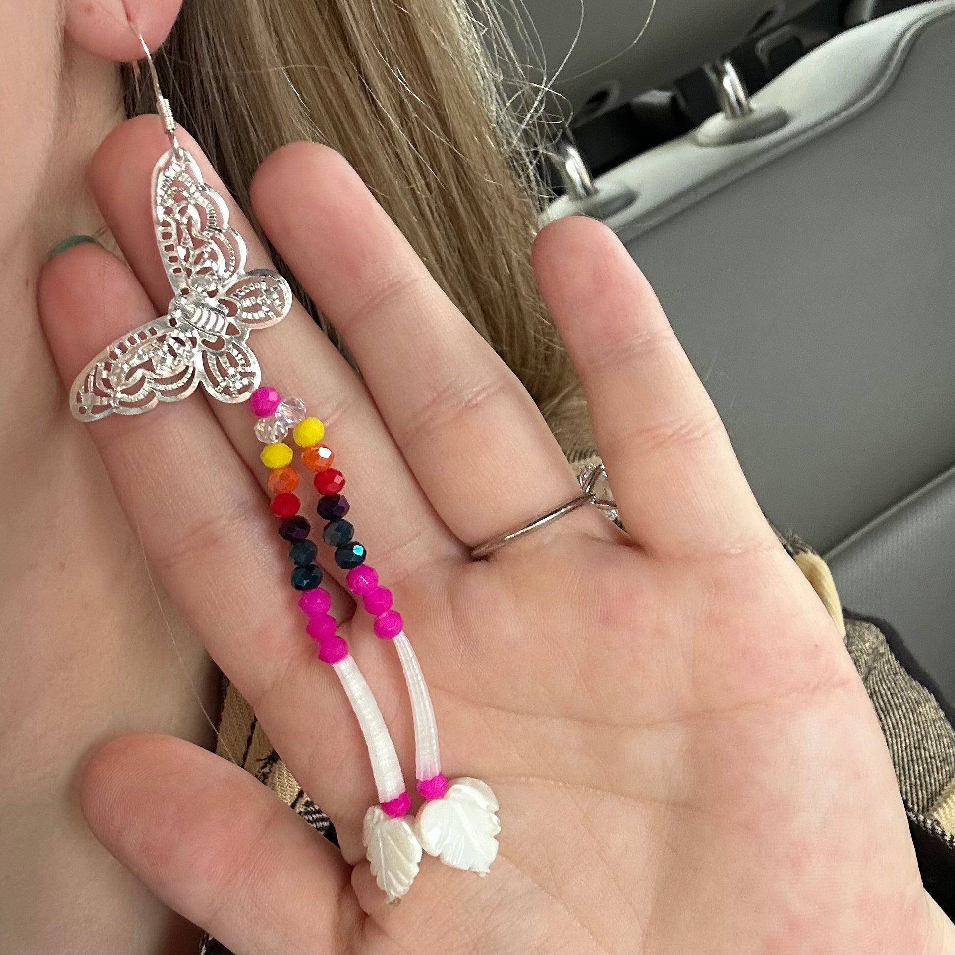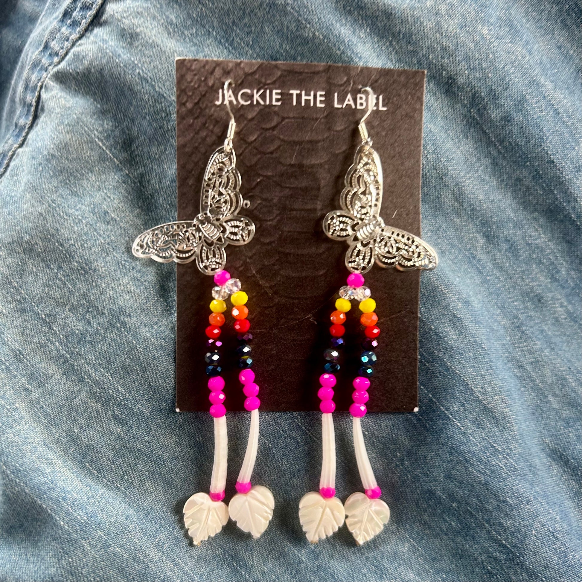 -Silver plated butterflies with dentalium shells and crystal beads.